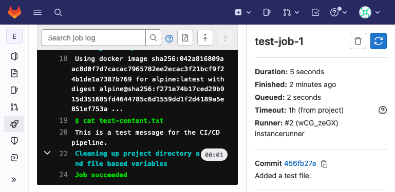 Using the pipeline script above and the example-project developed earlier in this guide, you can see this in action. Just commit a change to one of the project’s files. You can see the output on the page for test-job-1.